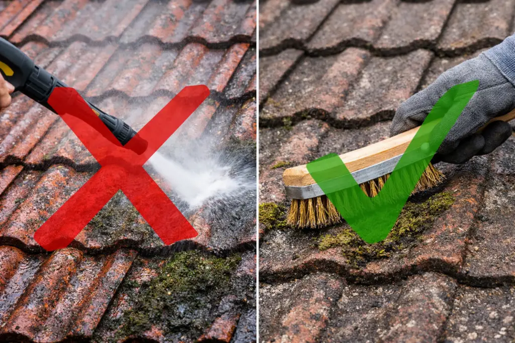 Le nettoyage de toiture haute pression peut fragiliser les couvertures, rendre les tuiles poreuses et augmenter les risques d’infiltration d’eau. Le brossage manuel constitue une solution plus durable et sécurisée pour le démoussage de toiture, garantissant un nettoyage en profondeur tout en préservant l’intégrité et l’étanchéité du toit.